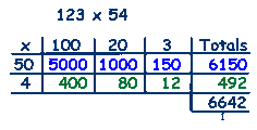 Now we can proceed to multiply 123 by the tens, 123 x 4, putting the answers into the correct columns of the next row. 3x4, then 2x4 and finally 1x4 to give 123 x 40 = 4920.